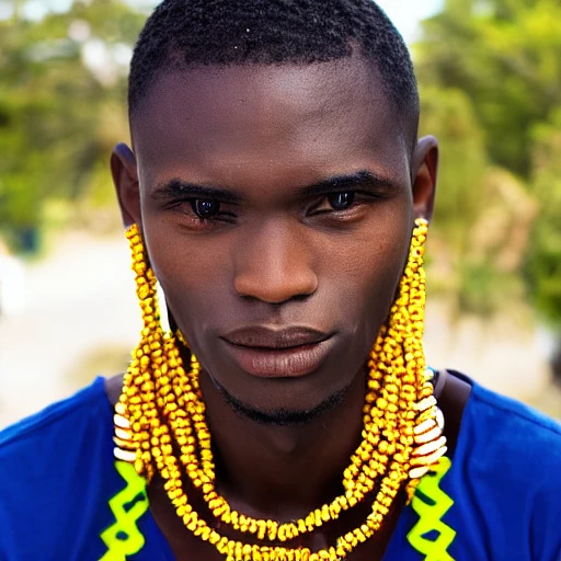 Young pretty african man with gems for eyes, wearing gold tribal beads --beta --video --upbeta --ar 16:9 --upbeta
