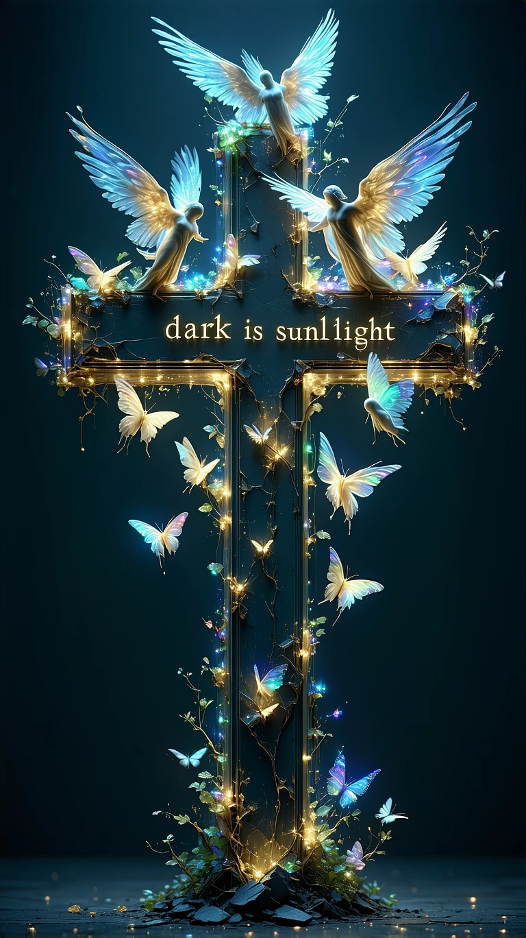 Ultrarealistic 3D sign of a cross, intricately designed with a glowing, translucent surface, filled with holographic mini angels in dynamic flight, their delicate wings shimmering with iridescent light, casting soft reflections, hyper-detailed, cinematic lighting, ethereal atmosphere, 8K resolution, octane render --v 7 --ar 16:9 --q 2 --style 4b Overlay bold gothic-style typography reading "dark is sunlight", embedded with rough, distressed textures that feel etched into the image. Designed as a poster, the artwork combines mystical grandeur with nostalgic decay — perfect for gallery or metaphysical print display.