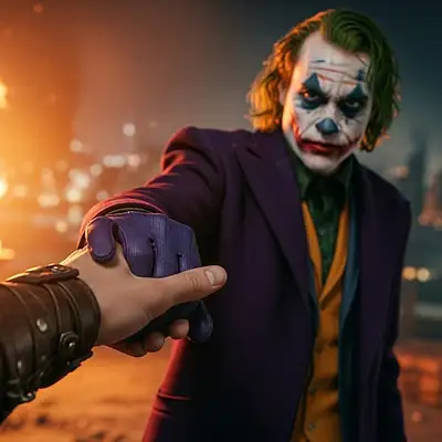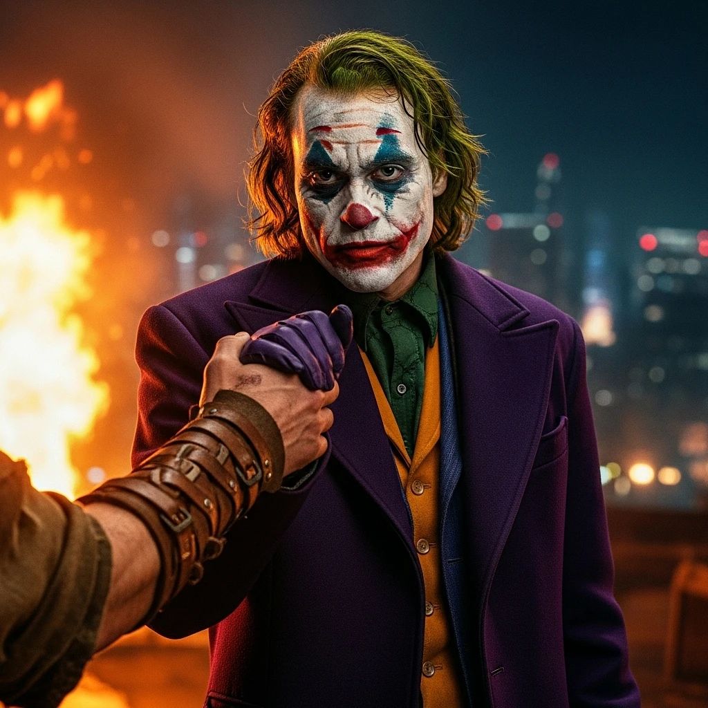 He is wearing a dark purple coat, and his face is characteristic of the Joker, with painted makeup and a sinister expression. The Joker's hand is holding the hand of another person, whose hand and arm are visible; the other person is wearing a brown, worn leather-like armband and clothing. The background shows a cityscape at night, with a blurred urban scene, and fiery orange and yellow light from a large fire. The scene has a dramatic, dark, and mysterious atmosphere