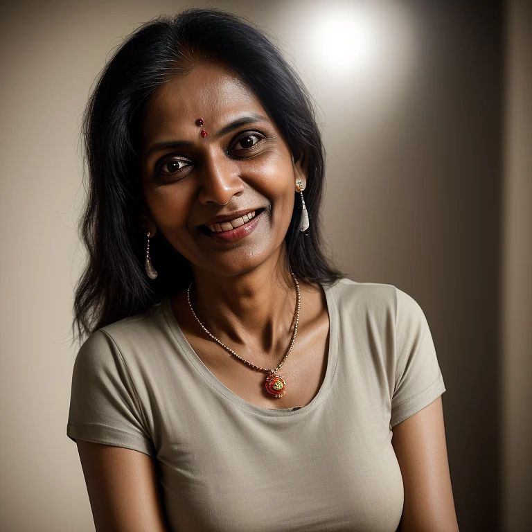 hyper realistic headshot photo of a 45 year old indian woman, t-shirt, extreme slim, extreme skinny, expensive jewelry, looking into the camera, smiling slightly, ultrarealistic, soft lighting, 8k