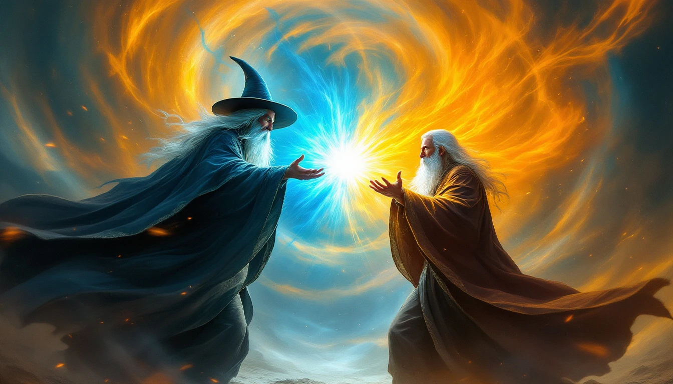 a dramatic confrontation between two wizards, their long white beards and hair a testament to their ancient wisdom. The wizard on the left wears a pointed hat, his eyes fixed intently on his opponent as he summons a radiant blue light from his outstretched hand. His counterpart, similarly attired in a long robe, mirrors his stance, unleashing a fiery orange glow. The background, a swirling vortex of orange and blue hues, evokes a sense of mysticism and wonder. The wide-angle perspective, reminiscent of fantasy artwork, draws the viewer into the heart of the battle, the wizards' robes and the turbulent sky blending seamlessly into a breathtaking tableau.