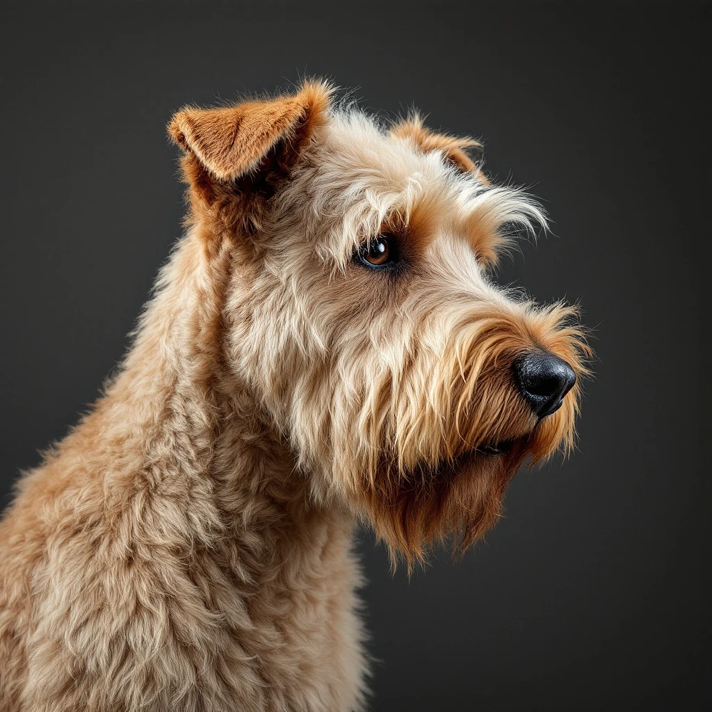 A detailed portrait of a soft-coated wheaten terrier, showing a luxurious, fluffy, light-brown coat with subtle variations in shade and texture, against a plain, dark gray studio backdrop. The focus should replicate the original photo's detailed fluffy fur texture and subtle lighting, capturing the dog's profile and posture with realistic accuracy.
