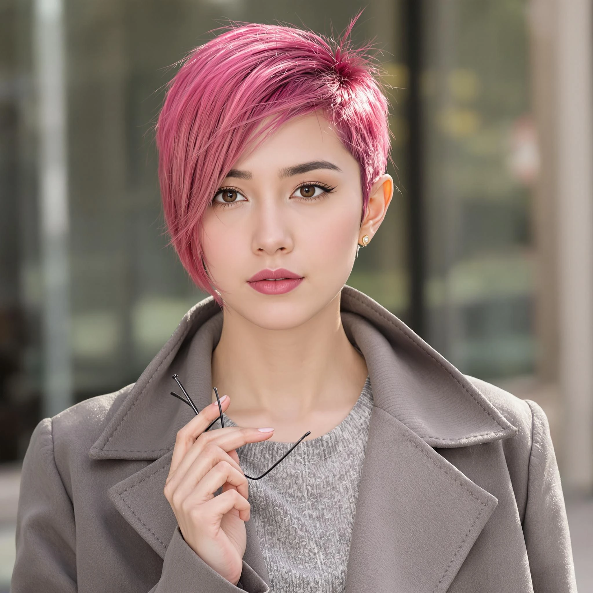 A girl with dark pink, ultra-short hair in a sharp, edgy cut. She wears a tailored three-piece outfit with a pent coat and holds glasses in one hand. Her facial expression is confident and calm, with realistic details like smooth skin texture and natural lighting on her face. Captured in ultra-high-definition, the scene highlights her hair, outfit, and the contours of her face. Soft natural light emphasizes her lifelike appearance, while the blurred background showcases her modern, fierce style.