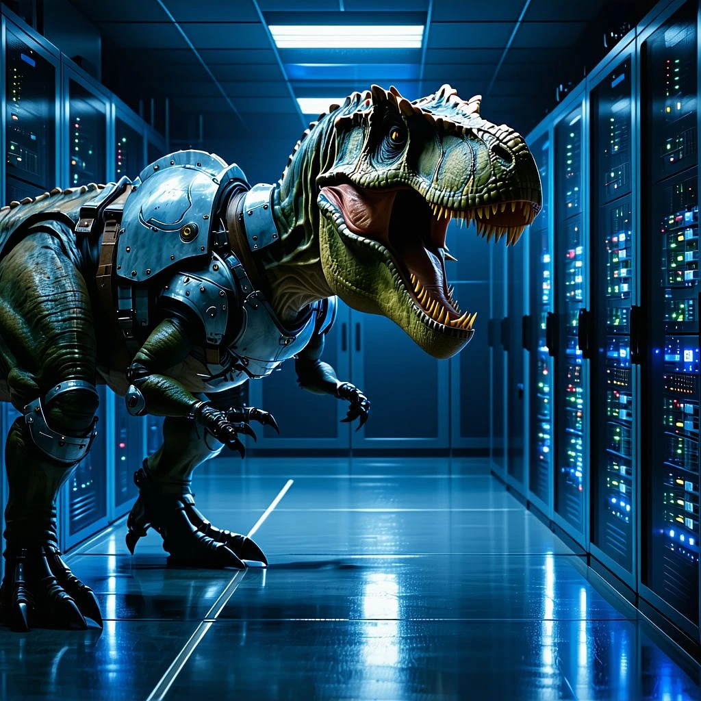 Hyper realistic eye level photo of a tyrannosaurus rex dressed in armor in a server room, nighttime, spy suspense, trying to hack into the mainframe, spyware, Frank Lloyd, Eames, Mies van der Rohe