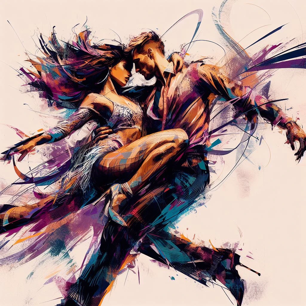 aesthetic, painterly style, modern ink, bachata couple dancers, very tight clothes, sensual, eye contact, dynamic pose, dynamic low angle, sultry, neonlight, expressive pose, detailed flying hair, urbanpunk, abstract texture multilayer background, masterpiece, neo-expressionist , more colorful and intricate details, modifier=CarnageStyle