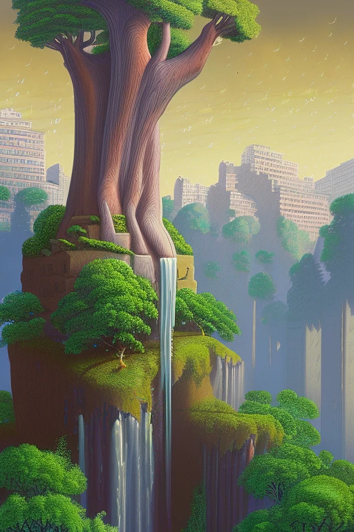 a massive tree in the center of the frame with city buildings around it, life is based off this tree and revolves around it, high detail, concept art, beautiful, typography river waterfall, by kaws, studio ghibli by tim hildebrandt, michael whelan, background environment, sharpen, an intricate, elegant, highly detailed digital painting, concept art, smooth