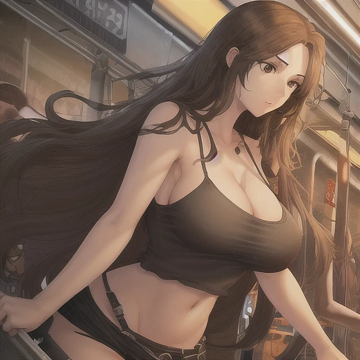 a woman, long brown hair, beautiful face, black spaghetti strap tank top, cleavage, subway train setting, super realism, 8k, giant bust