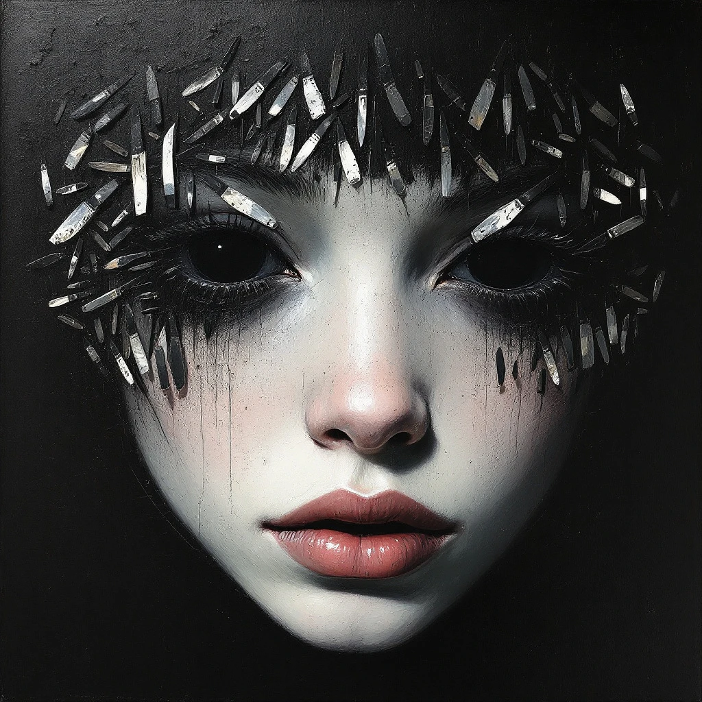 artistic, oil painting, face, portrait of girl, empty eyes, grainy touch, minimalist avant-garde, rich detailing, many knives, rough, dark mood --ar 9:16 --quality 2 --style raw --personalize ue2yzjl --stylize 300 --v 6. 1