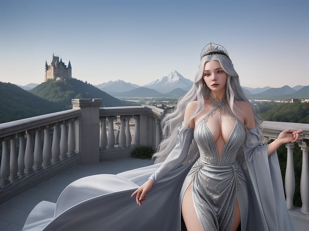 a woman standing on a balcony, gazing out at a breathtaking landscape of mountains and a castle in the distance. Her long, silvery hair flows behind her like a river of moonlight, with a crown adorning her head. She wears a dress with a plunging neckline and a high slit, showcasing her thigh, and a train that billows behind her. Her attire is completed with silver armor, a silver tiara, and a silver sword in hand. The background features a majestic mountain range with snow-capped peaks and a castle nestled among the clouds. The scene is set against a backdrop of a cloudy sky with the sun shining through, casting a warm glow. The image is captured with a wide-angle camera perspective, emphasizing the grandeur of the landscape.