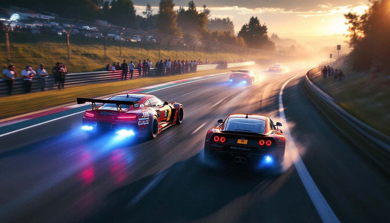 The race track turns. The first 2 (two) cars with logos of different clubs on the sides are racing along the track, overtaking each other. Light smoke from under the wheels. ALL cars on the highway are turned in one direction. No more cars. Spectators stand outside the track fence. Cars are well illuminated by sunlight. The camera looks from the side and slightly from above and turns behind passing cars. Cyberpunk style.