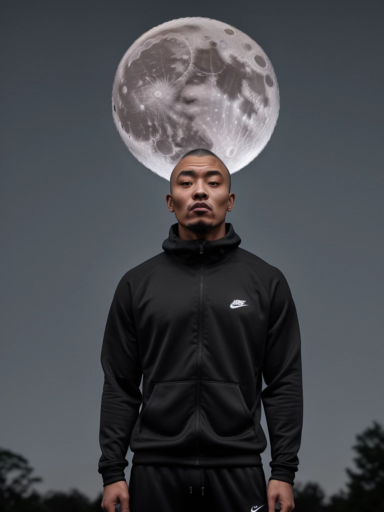 man with 🗿head using nike tracksuit, night time, big full moon in the background, ultra realistic, shoot with Sony Alpha a7R IV FE 70-200mm f/2. 8 GM OSS lens ISO 100, 8k, high definition, matte painting –w 2176 –h 3840 –iw 1 -v 5 --s 1000 --ar 7:4 --raw