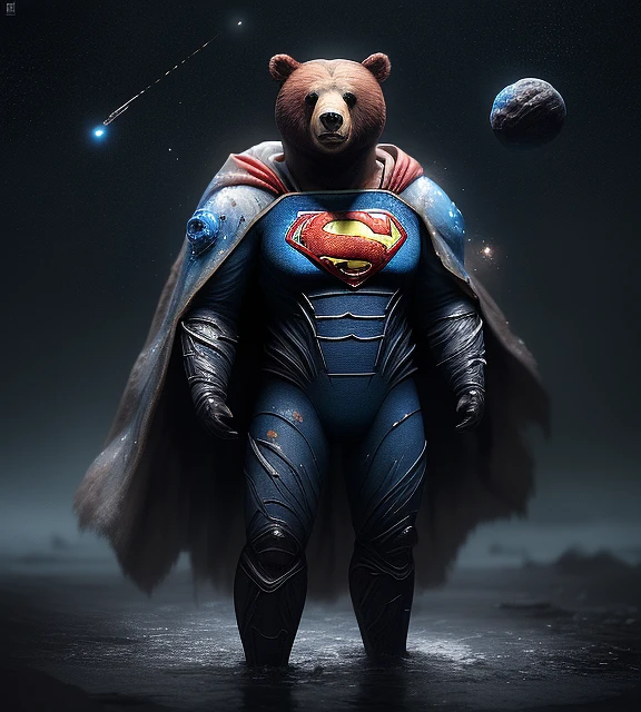 the bear is dressed superman and standing in an outer space suit, in the style of brushwork exploration, firecore, photo-realistic techniques, angura kei, soggy, cute and dreamy, frostpunk --ar 10:13