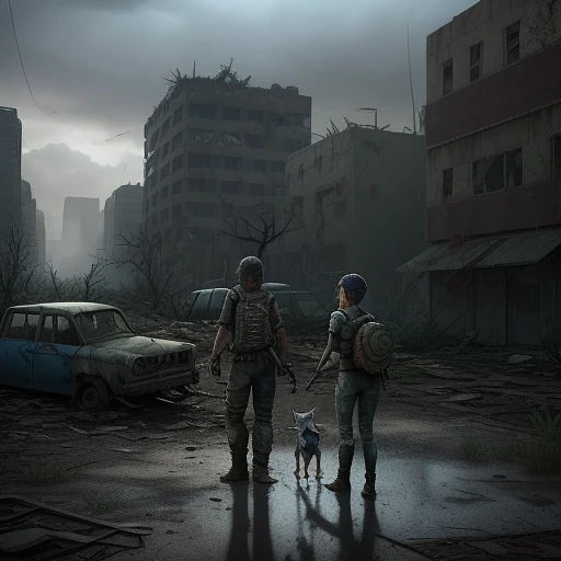 a photo of a survivor and their Blue Heeler dog in a post-apocalyptic city inspired by 'The Last Of Us'. The city is in ruins, overrun by wild vegetation, with rusty cars scattered across the streets. The survivor wears improvised clothing and carries a worn backpack, while the cloudy sky reflects the desolation of the world
