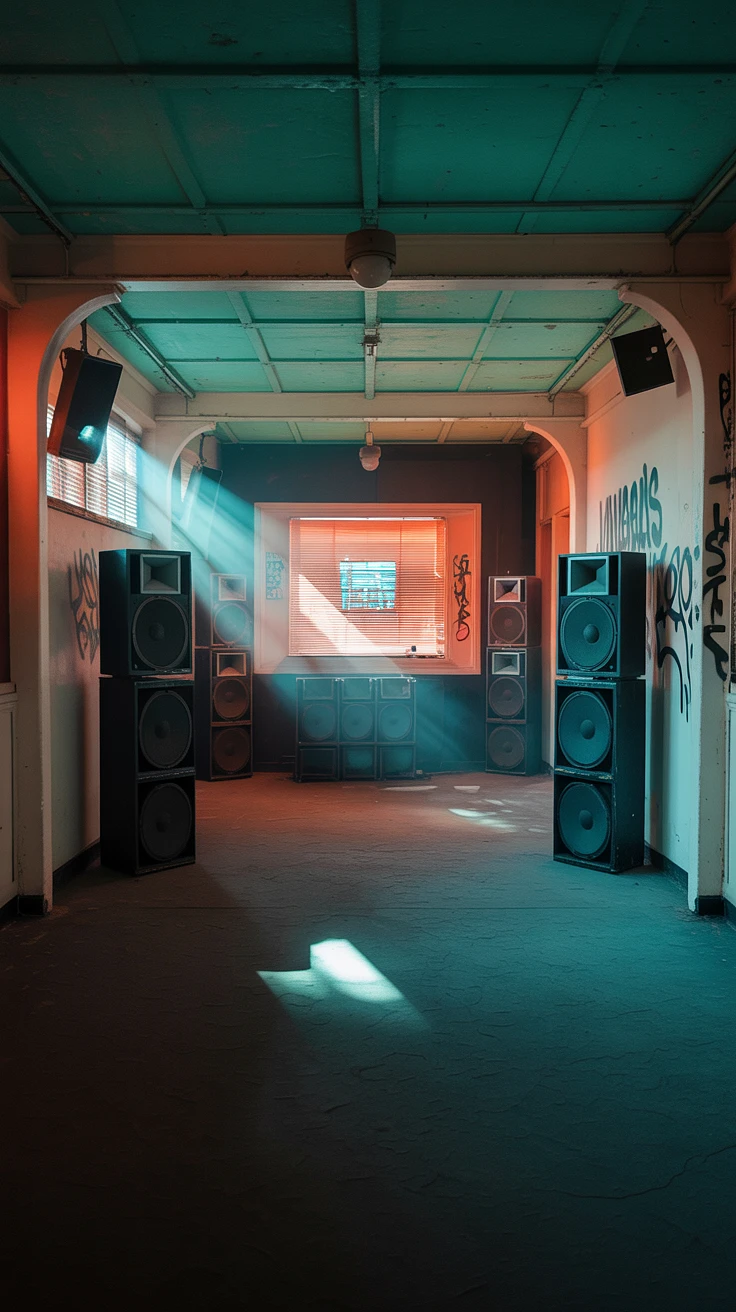 Una vista melancólica y evocadora del interior vacío de La Hacienda en Mánchester, años 90. La pista de baile desierta aún conserva ecos invisibles de las raves pasadas. Luces de neón apagadas, altavoces cubiertos de polvo, grafitis en las paredes. Un haz de luz entra por una ventana rota, iluminando partículas en suspensión. El ambiente es silencioso pero cargado de historia, como si la música aún flotara en el aire. Estilo cinematográfico, tonos fríos, enfoque nostálgico.