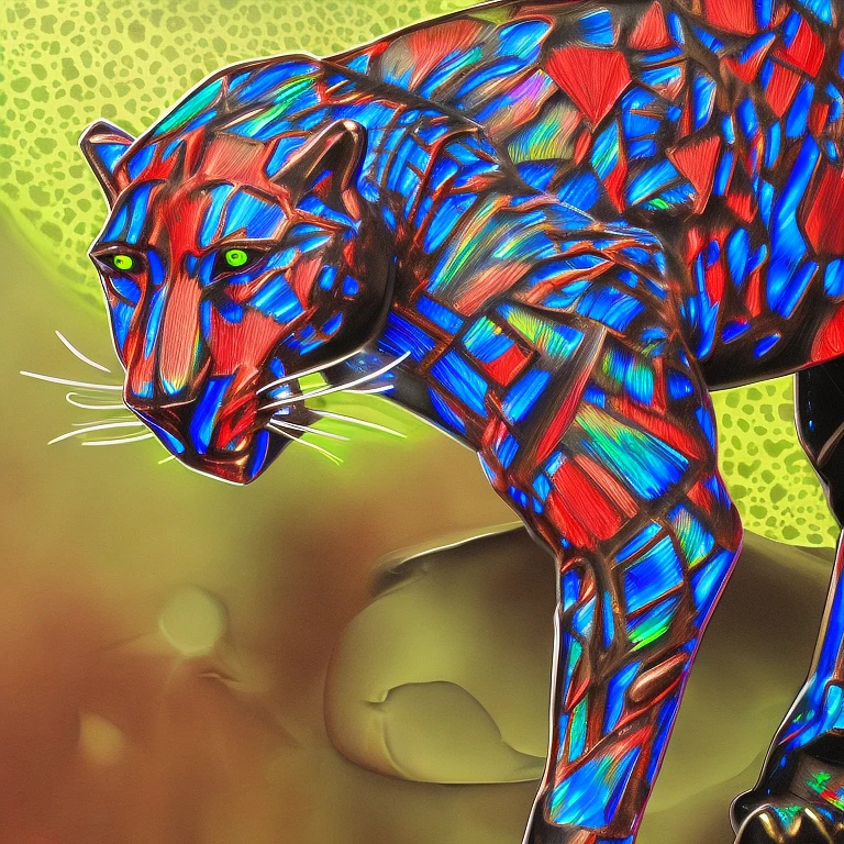 a very detailed close up +the animal black iridescent vibrant colored panther with blue bioluminescent eyes in intricate made of liquid red metal armor, in the style of fluid dynamic brushwork, dark black and black, hue5, sharp angles, close - up, changelingcore --ar 128:192 --ar 1:2 --v 5 --s 300 --q 5 upbeat