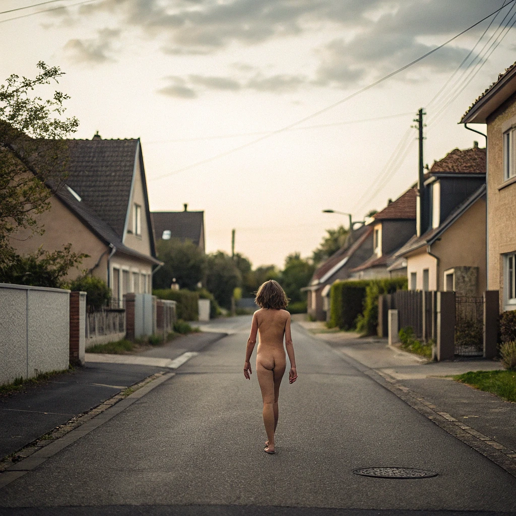 A girl in daylight, walking naked in the street full body view her height is approximately 150-155 and her weight is approximately 70-80 kg.