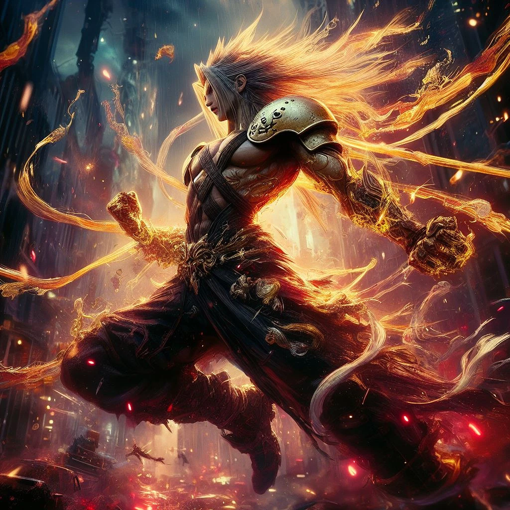 painterly style, FF7's Sephiroth fighting at war, raging, character design, body is adorned with glowing golden runes, yellow aura around him, body dynamic epic action pose, intricate, highly detailed, epic and dynamic composition, dynamic angle, intricate details, multicolor explosion, blur effect, sharp focus, uhd, hdr, colorful shot, stormy weather, tons of flying debris around him, dark city background, modifier=CarnageStyle, color=blood_red, intensity=1. 6