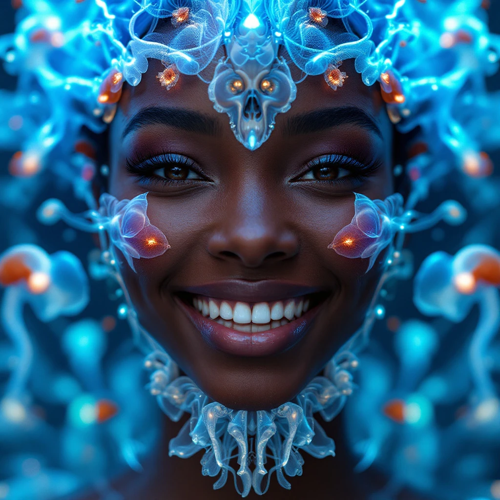 African-american close-up portrait. Smiley face. jellyfish phoenix head, nautilus, orchid, skull, betta fish, bioluminiscent creatures, intricate artwork . octane render, trending on artstation, t symmetrical artwork. cinematic, hyper realism, high detail, octane render, 8k