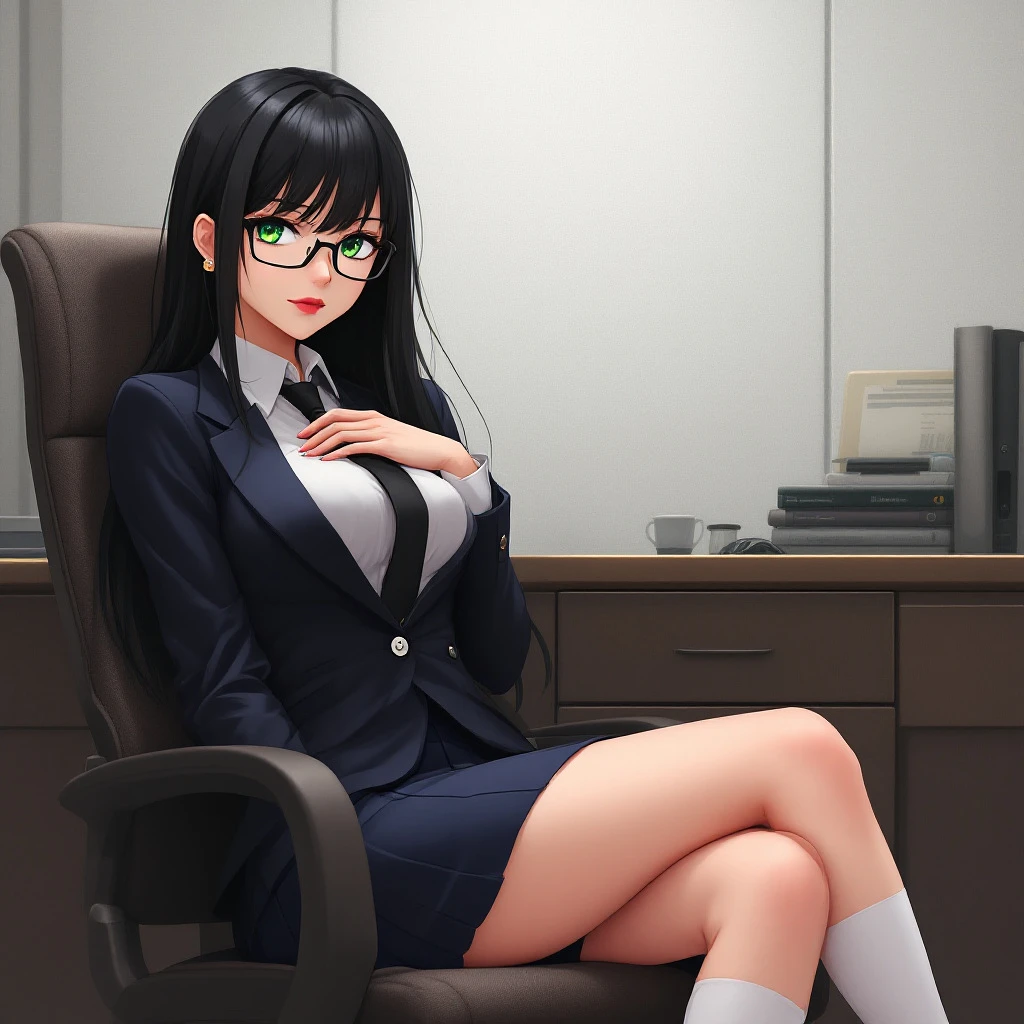 anime, woman, black hair, long hair, green eyes, black glasses, red lips, white shirt, black tie, black blazers, tight blazers, short dark blue skirt, highschool skirt, white socks, black shoes, bored expression, big chest, sitting on a chair at an office, sitting with legs crossed, skinny belly