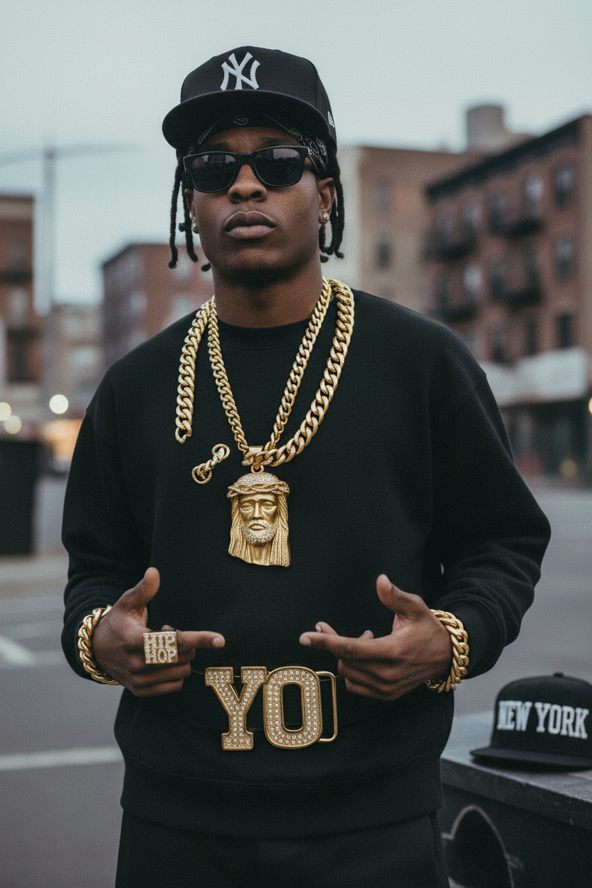 A young male model wearing a black sweatshirt and a black New York Yankees cap is fully styled with flashy hip-hop accessories. He has on a thick gold chain necklace with a large Jesus head pendant, along with another oversized gold chain around his neck. On his wrist he wears chunky gold bracelets, and on his fingers he has a bold golden “HIP HOP” ring. His belt buckle is a large, shiny golden piece shaped like the word “YO,” encrusted with diamonds. He is also wearing sleek black sunglasses and a black cap embroidered with the word “NEW YORK.” The overall look should appear photorealistic, urban, and styled in the classic hip-hop fashion.