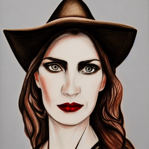 **a drawing of a pale female with straight ginger hair hazel eyes, a serious expression, and red lipstick in the style of wildwest gothic, western-style portraits, sharp focus, moody lighting, realistic figures, wearing a white cowboy hat.