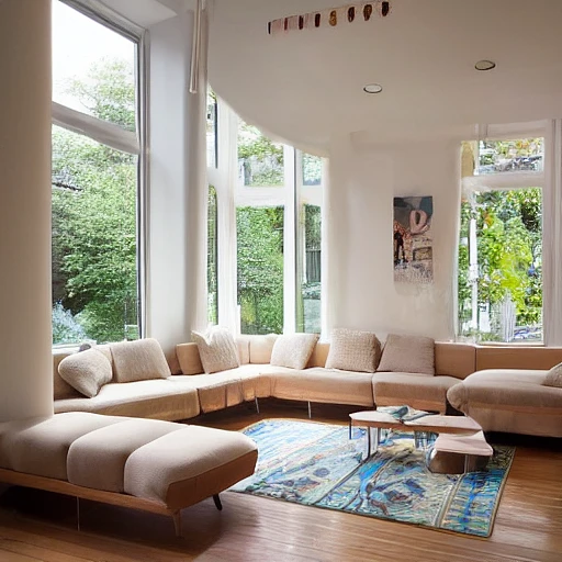 high resolution photography interior design, dreamy sunken living room conversation pit, wooden floor, small windows opening onto the garden, bauhaus furniture and decoration, high ceiling, beige blue salmon pastel palette, interior design magazine, cozy atmosphere