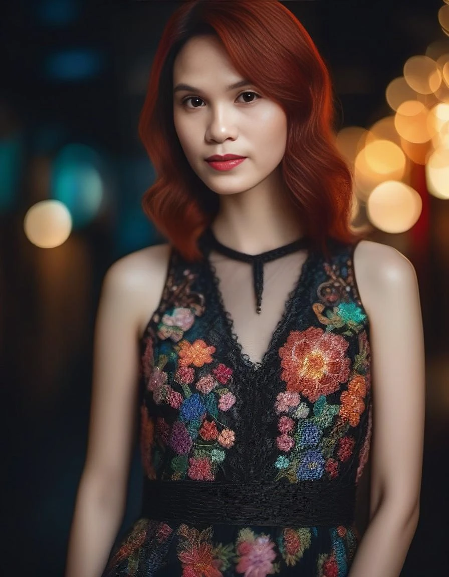 Gorgeous redhead with freckles, wearing a colorful, vibrant, detailed embroidered dress, medium-full shot, at night