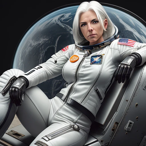 High resolution photography of a midage muscular female astronaut with white hair, icy eyes in leather jacket, grey leather pants