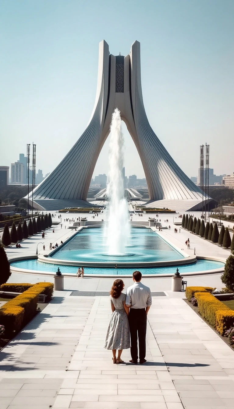 A young couple from the 1950s stands in Tehran’s iconic **Azadi Square (formerly Shahyad Square) **, with the magnificent **Shahyad Tower** rising behind them. The tower, a masterpiece of Persian modernist architecture, stands tall with its distinctive **parabolic arch**, blending both traditional Iranian and contemporary styles. Its white **marble-clad surface**, sourced from Esfahan, glows under the afternoon sun, with intricate **geometric patterns** adorning its facade. The tower’s **four grand legs curve inward**, forming an elegant archway at the center, symbolizing the historical gateway to Tehran. * *The open **plaza surrounding the tower** is paved with large **stone tiles**, leading toward a **vast circular fountain** at the base of the monument. The water in the fountain reflects the sunlight, creating shimmering ripples that contrast with the solid architectural lines of the tower. Around the square, neatly arranged **pathways** extend outward, guiding visitors through the landscaped green areas with small trees and traditional Persian-style benches. * *The **couple stands near the edge of the plaza**, dressed in elegant 1950s attire. The **girl**, with voluminous, curly hair, cat-eye eyeliner, and red lipstick, wears a **floral-patterned dress** with a flared skirt. A gentle breeze lifts the hem slightly as she glances at her companion. The **boy**, in a **light-colored suit** with a thin tie, stands beside her, his neatly combed hair and thin mustache giving him a refined look. Their hands nearly touch as they exchange a soft smile, immersed in the beauty of the moment. * *Around them, a few **pedestrians walk leisurely**, some in **Western-style suits** and dresses, while others wear **traditional Iranian clothing**. The city’s **classic cars** from the era are parked nearby, their polished surfaces reflecting the golden hues of the afternoon sky. The **atmosphere is peaceful**, filled with the distant sound of footsteps, hushed conversations, and the gentle flow of the fountain. The **warm, muted tones of the scene** capture the nostalgic essence of 1950s Tehran, as the **Shahyad Tower** stands proudly as a beacon of Persian heritage and modernity.