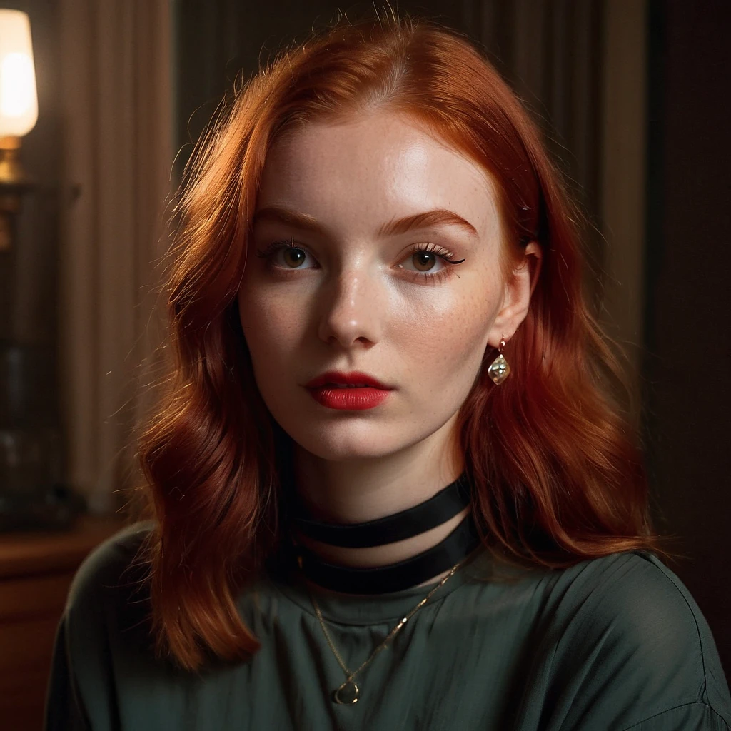 Raw photo, (25yo redhead girl:1.2) , makeup, graphic eyeliner, rouge, (choker:0.9) , realistic skin texture, oversize shirt, (red:0.8) , softcore, warm lighting, cosy atmosphere, instagram style