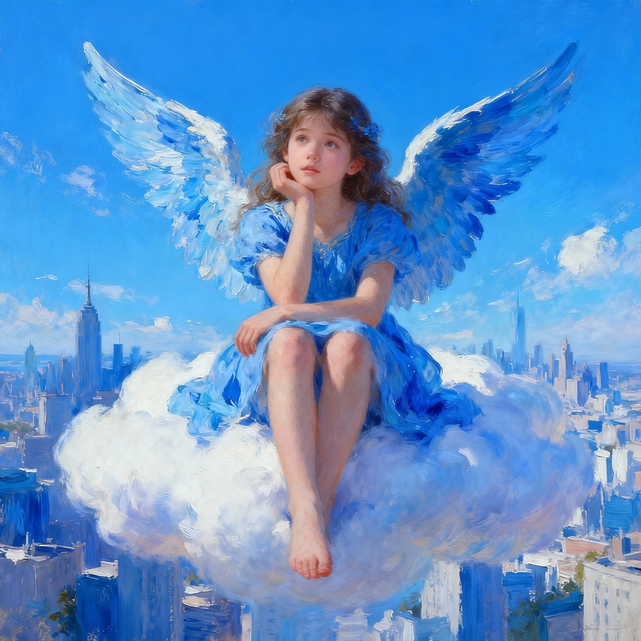 female - azure angel, , amazing blue clear sky background, city, portrait, hyperrealism