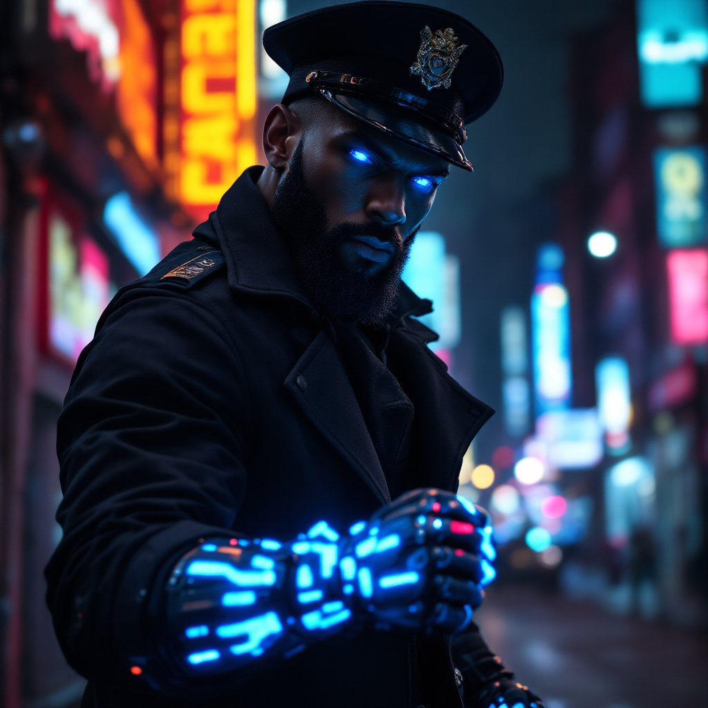 FLUX prompt: photo of a african muscular strong policeman, bear...