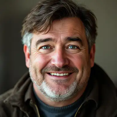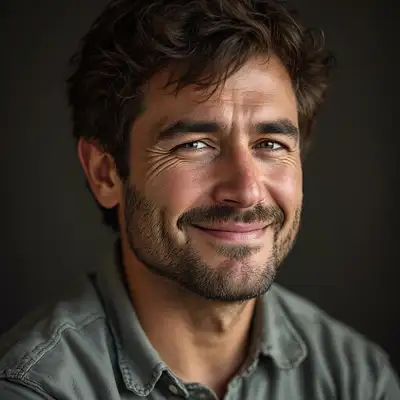 Generate a highly realistic, high-resolution photo of an man in his 20s, with brown hair and natural features. The man should appear a bit chubby, with a slightly tired but happy expression. His facial features should show wrinkles and the subtle signs of age, capturing the texture of his skin in a lifelike way. The image should be indistinguishable from a real-life photograph, taken with a professional camera from 3m distance. The lighting and background should be realistic, and the composition should reflect a natural, professional portrait style, emphasizing warmth and authenticity.