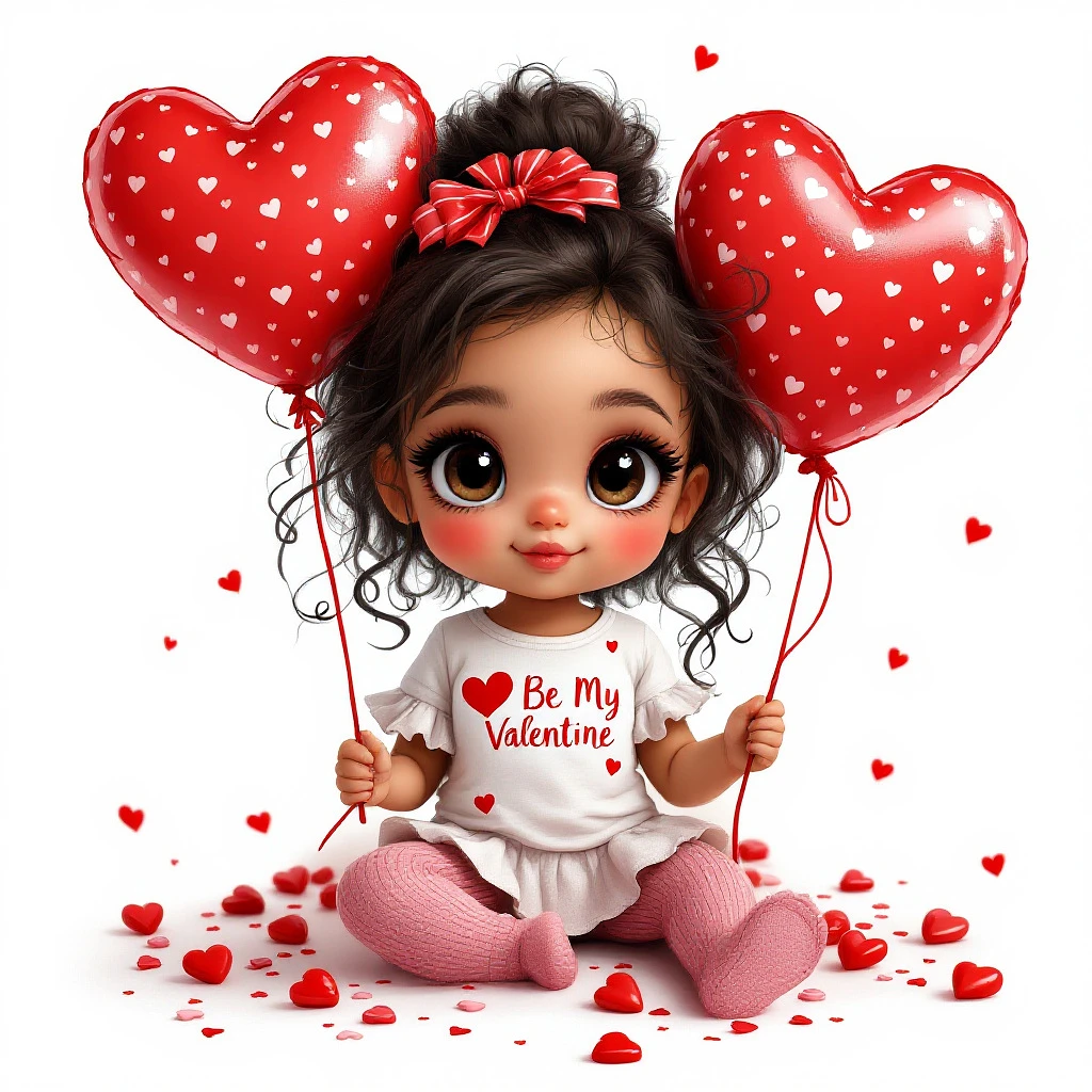 chibi cartoon art mixed with oil paint american big brown eyed detailed face baby she has long lashes a she’s wearing a Be My Valentine theme tshirt with ruffle sleeves and matching tights she’s sitting holding heart shaped with small white heart pattern on the ballons with candy hearts all around her , with a Smokey red and white array around then on a white background oiled up skin fine lines