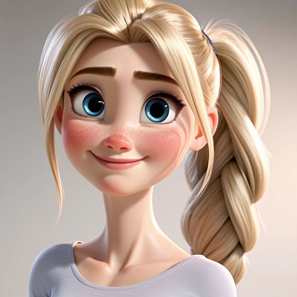 3D stylized render of a petite adult woman, height 150cm, slim and curvy figure with youthful proportions, small breasts, narrow shoulders, wide hips, soft skin, expressive blue eyes, light blonde ponytail, round face with delicate features, realistic Pixar-style lighting and materials, subtle sweat on skin, soft bounce light, clean background
