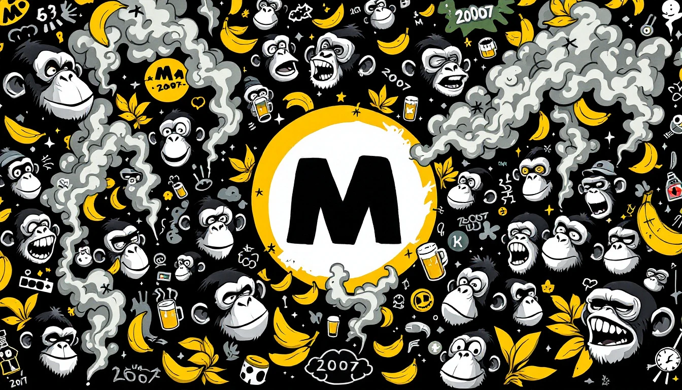 An intricate and mainly black, white, yellow, green, (two contrasting, extra colors for details) , graffiti-style poster featuring various elements, such as 31 cartoon characters, symbols of urban culture, smoke and dynamic expressions, focusing on minimalistic chimp faces, the letter 'M' inside a large circle, bananas, beer, is part of the image. the word and '2007' is hidden --ar 63:128 --stylize 750