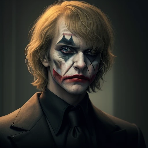 A man with bangs and medium-length blond hair stands in the foreground of the image. He is turned away from the viewer and looks into the distance. He has Joker makeup on his face.