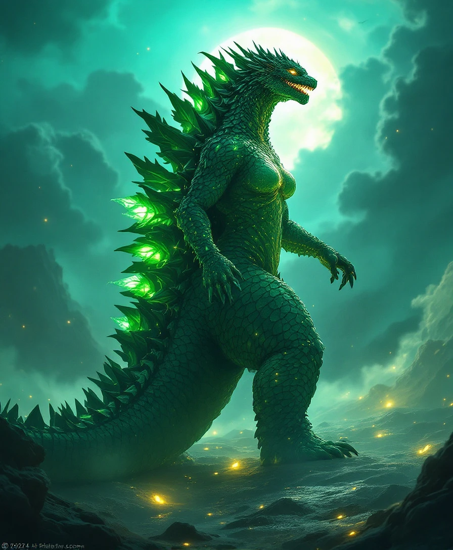 Imagining a sexy female version of Godzilla involves blending the iconic features of the beloved monster with a more stylized and alluring aesthetic. Here’s a description of how she might look: **The Alluring Titan**: This female Godzilla stands tall and powerful, with a striking silhouette that combines both the monstrous and the seductive. Her scaly skin is a mix of deep emerald green and shimmering teal, glistening under the moonlight. Her physique is curvy and commanding, with a graceful yet formidable stature that captures the essence of a goddess. Her face retains the classic Godzilla features, with large, expressive eyes that shine with intelligence and a hint of mischief. These eyes are flecked with gold, giving them an enchanting depth. Despite her fearsome appearance, her lips are subtly tinted a soft, glossy shade, enhancing her allure. Long, sleek spikes cascade down her back, flowing majestically like a mane, with the tips glowing softly in a bioluminescent hue. Her tail is long and elegantly curves behind her, adorned with delicate fins that have a lacy appearance, reminiscent of a mermaid’s tail. She might wear a form-fitting outfit made of a material that mimics her scales, allowing for flexibility while enhancing her curves. Accessories could include metallic accents that reflect a fierce, warrior-like quality—a belt made of stylized chains or armor-like bands around her arms and legs, blending power with femininity. When she stands amidst the cityscape, her presence is both alluring and intimidating, capable of invoking awe and admiration from those who gaze upon her. This sexy female Godzilla embodies strength and beauty, merging the fearsome legacy of her counterparts with an irresistible charm.