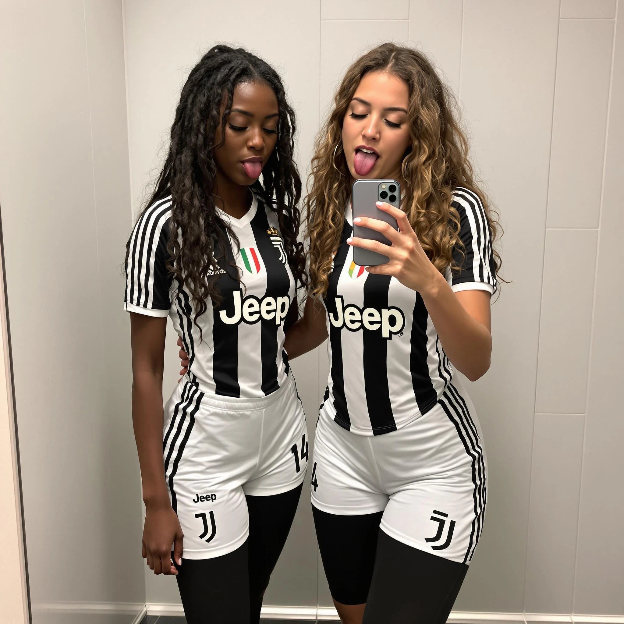 Two beautiful Italian, teen girls, one white girl with long curly brown hair, the other one, a black girl with long black curly hair. Both of them are wearing a tight, original, black and white striped, Juventus jersey. They also wear tight Juventus shorts. They are also wearing black tight leggings. The white girl is on the right and is taking a picture of them at a mirror in a lockerroom with a detailed iPhone 14. Her eyes are closed. She is sticking out her tongue. Her nail polish is white. She is on the right on the picture while holding her detailed iPhone more right, and the black girl on the left, and looking not at the mirror but at her phone. The photo is very grainy, and the ADIDAS logo and the JEEP logo are visible with high quality. Her iPhone is very detailed Seed: 130