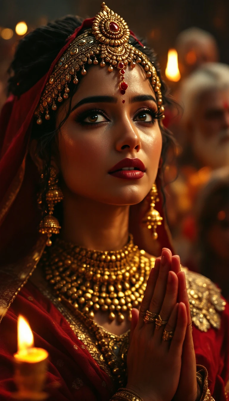 "A close-up of Draupadi’s face, tears welling in her wide eyes, her lips trembling in despair as she raises her hands in prayer. Her deep red and gold saree, adorned with intricate embroidery, flows endlessly in golden light, defying Dushasana’s grip. The scene is dramatic, with a divine glow enveloping Draupadi, and warm torchlight flickering in the background, casting shadows on the ashamed faces of the Kuru elders. Cinematic close-up, ultra-realistic facial details, expressive sorrow, volumetric lighting, photo-realistic mythological storytelling, 4K ultra-HD, hyper-detailed textures, dramatic storytelling. "