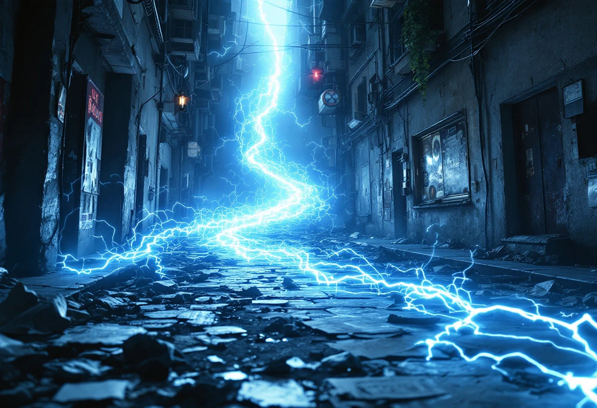 The central focus of the scene is the dynamic and electrified waveform—a surreal, glowing energy beam that pulses and snakes its way down the gritty alley, originating from the portal in the distance. This waveform resembles an electrified, sine-wave-like structure, twisting and undulating unpredictably as it moves forward. It pulsates with immense power, appearing alive as it discharges bursts of energy in every direction. The core of the waveform glows intensely with a brilliant, almost blinding white light, edged by vivid neon blue that radiates outwards in an ethereal, pulsating glow. Surrounding this central core is a subtle halo of flickering cyan and electric indigo, enhancing its hypnotic visual effect. As the waveform travels through the alley, it interacts with its surroundings in dynamic and intricate ways. Each pulse of energy causes static electricity to ripple through the environment. The crumpled paper and torn posters scattered across the ground lift slightly, trembling in the air before being propelled a few inches forward by an invisible force. Occasionally, sparks of energy leap from the waveform, causing minor discharges to nearby objects. Stray arcs of blue lightning crackle outward, striking the rusted metal trash cans, sending faint vibrations through them and creating an eerie metallic echo. The electricity’s influence is visible on the surrounding neon signs, which flicker sporadically as the energy overloads their circuits. One of the hanging signs, featuring Japanese kanji for a ramen shop, bursts into a cascade of sparks as a particularly strong energy arc strikes its frame. Nearby, a smaller lightbox sign emits a faint buzzing sound, its dim glow struggling against the overwhelming brightness of the waveform. The waveform’s motion is not smooth but erratic, mirroring the chaotic energy within it. It twists unpredictably, almost like a lightning bolt in slow motion, with sections of its undulating path coiling tightly before springing outward in sharp, jagged bursts. Small fragments of glowing particles break off as it travels, dissipating into the surrounding air like embers from a fire. These particles shimmer momentarily before vanishing, leaving faint trails of light in their wake. The interaction with the ground adds another layer of realism. As the waveform passes over the puddles scattered across the alley floor, the water ripples outward in concentric circles, reflecting the beam’s vivid colors in shimmering patterns. In some spots, the water appears to boil briefly as tiny electrical sparks dance across its surface. Bits of loose debris—cigarette butts, bottle caps, and scraps of cardboard—jitter and vibrate under the waveform’s influence, occasionally sparking as if charged with static electricity. The walls of the alley bear scorch marks and faintly glowing streaks where the waveform’s energy has grazed them. In places where its tendrils of electricity strike, the bricks heat up momentarily, leaving faint trails of steam rising into the air. The posters peeling from the walls ripple violently, some catching fire at their edges as a stray bolt grazes them. The burning paper curls inward, its edges glowing orange before turning to ash, which drifts into the hazy air. As the waveform advances toward the viewer, its presence dominates the scene. The interplay of light and shadow is intense: the alley alternates between being bathed in its radiant glow and plunged into shadow as the beam twists unpredictably. The high-energy pulses create a strobing effect, mimicking the rapid, rhythmic pace of a techno track. The scene feels alive, with every detail—whether static or moving—responding to the waveform’s electrifying presence. This combination of relentless energy, unpredictable movement, and vivid neon colors makes the waveform the focal point of the artwork, capturing the chaotic yet mesmerizing spirit of melodic techno. The viewer is left captivated by the visual and emotional tension between the gritty realism of the alley and the surreal, otherworldly power of the waveform.