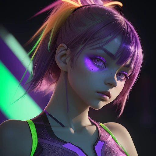 a beautiful lightup purple girl is posing in front of her neon clothing, in the style of dark orange and azure, shallow depth of field, sunny impressionism, light green and red, close-up intensity, photo-realistic techniques, bright and bold color palette --ar 1:2 --stylize 750 --v 5. 2