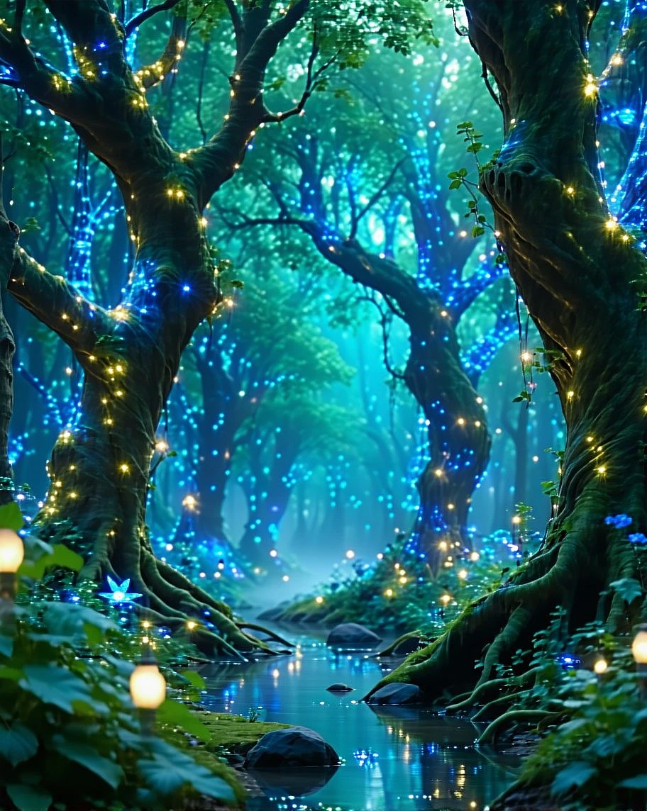 "A magical enchanted forest with glowing bioluminescent trees, vibrant fairy lights floating in the air, mystical creatures roaming, ethereal mist, dreamlike fantasy landscape, ultra-detailed, cinematic lighting. "