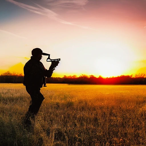 a hunter with a shotgun walks out of a field towards a muscle car at sunset