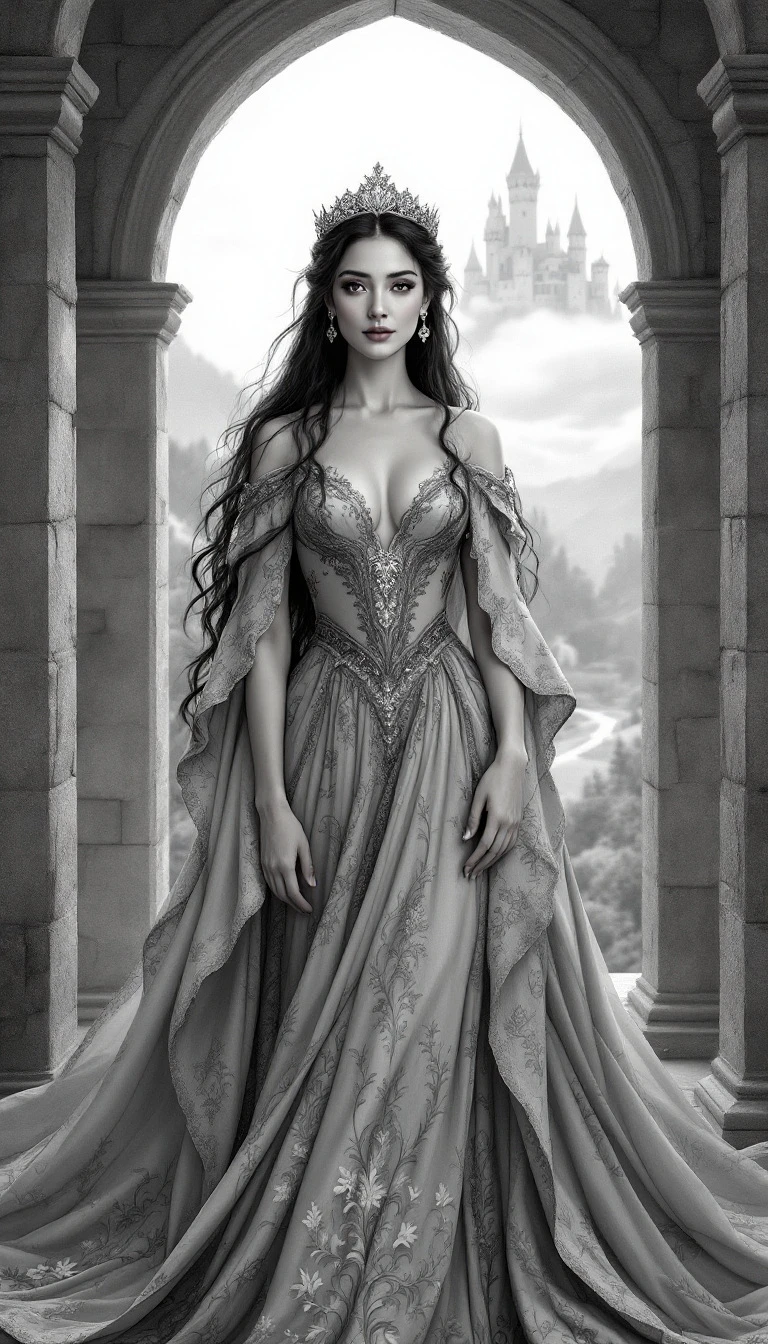 A regal figure stands poised within a stone archway, her expression conveying a blend of strength and serenity. Adorned in an intricately detailed gown that flows elegantly, she wears a delicate crown atop her long, dark hair, complementing her noble aura. The background reveals a picturesque landscape featuring distant castles, hinting at a fairytale setting. Soft gray tones dominate the artwork, enhancing its timeless quality and emphasizing the intricacies of her attire. The overall mood is one of grace and authority, evoking a narrative steeped in royal heritage and quiet power.