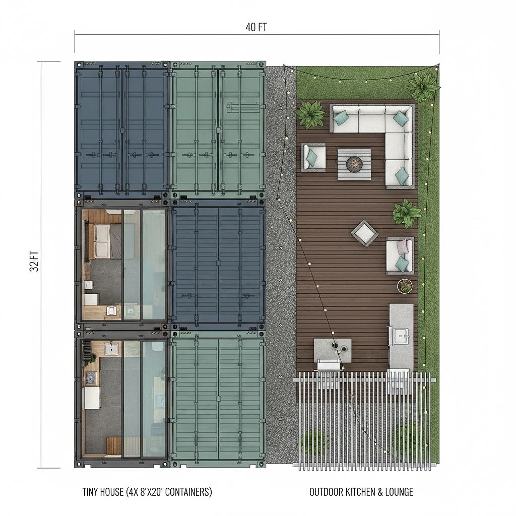 a space 40ft by 32ft, half the space 20ft by 32ft has a tiny house made of 4, 8ft by 20ft containers laid side by side. The other space 20ft by 32ft is an outdoor space with a seating area and an outdoor kitchen.