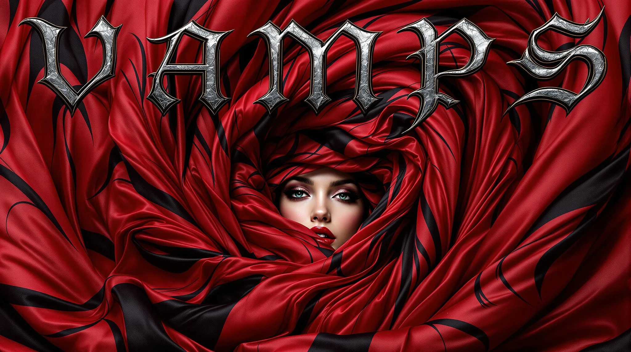 VAMPS magazine cover features a mesmerizing woman wrapped in a swirling vortex of red and black fabric. The fabric spirals around, blending her figure into a dynamic, surreal pattern. Her face is seductive, partially hidden within the hypnotic waves of the fabric, creating an otherworldly, ethereal look. The VAMPS logo in Gothic font at the top is metallic and striking against the abstract design.