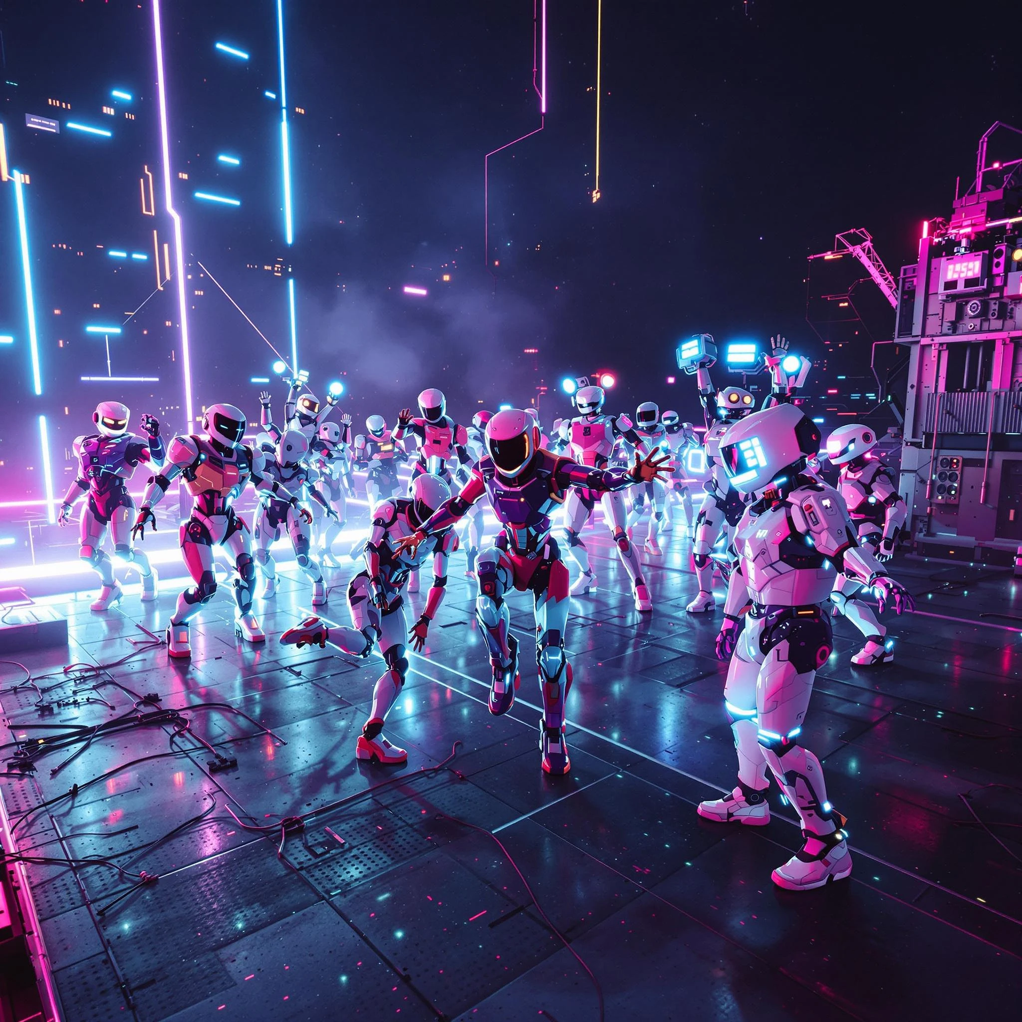 Shot 1: "Robot Dance Party on a Skyscraper Roof" Prompt: It's night on the rooftop of a high-tech futuristic skyscraper, illuminated by bright neon lights and flashing strobe lights. Many futuristic robots of different shapes and colors are dancing on the roof, their movements synchronized with the intense beats of rave music. The robots glow in the dark, creating a magical effect. At the edge of the roof, a massive energy generator powers the rave's lights and music. The camera moves in FPV style between the dancing robots, showcasing the diversity of their dance moves and the electrifying party atmosphere.