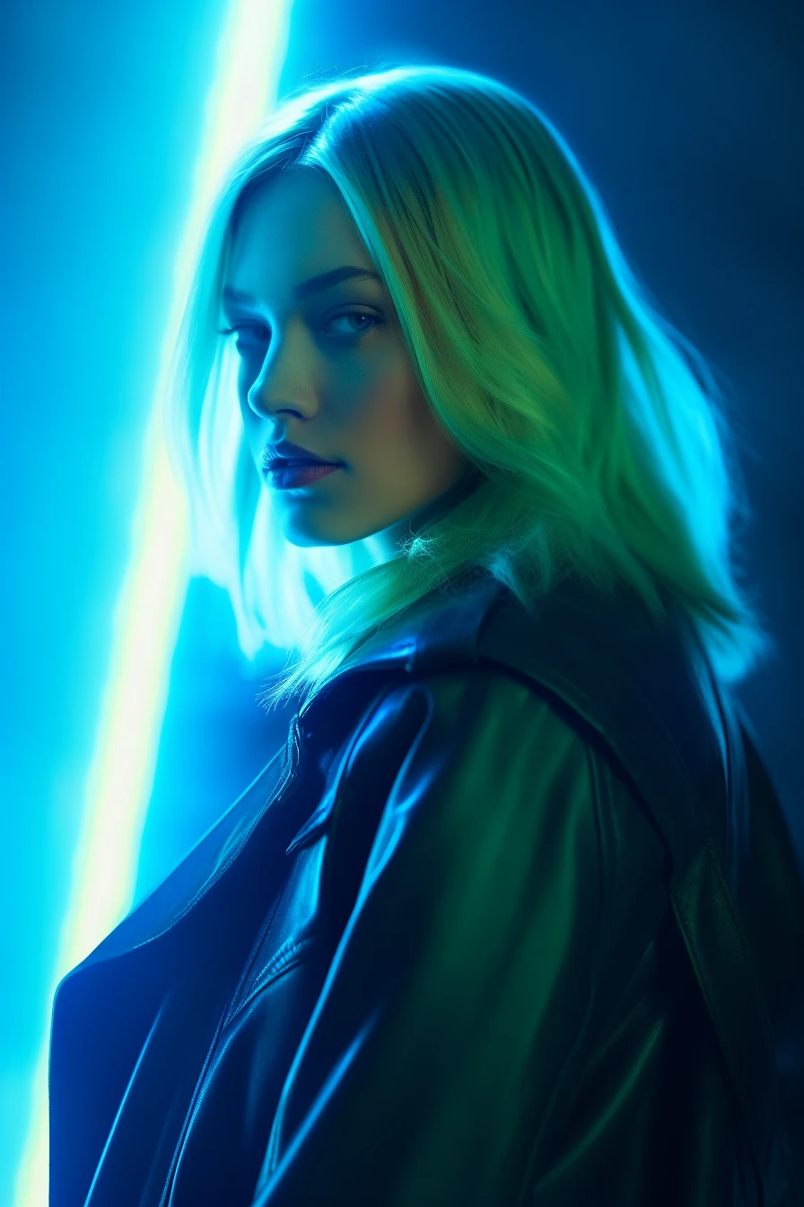 a young woman with blond hair and blue light on her face, in the style of rendered in cinema4d, epic portraiture, green and amber, realistic human figures, leather/hide, new american color photography, golden light, Fujifilm X-T4 , Nikon AF-S Nikkor 85mm f/1. 4G --ar 2:3 --s 750 --q 2 --style raw --v 5. 1