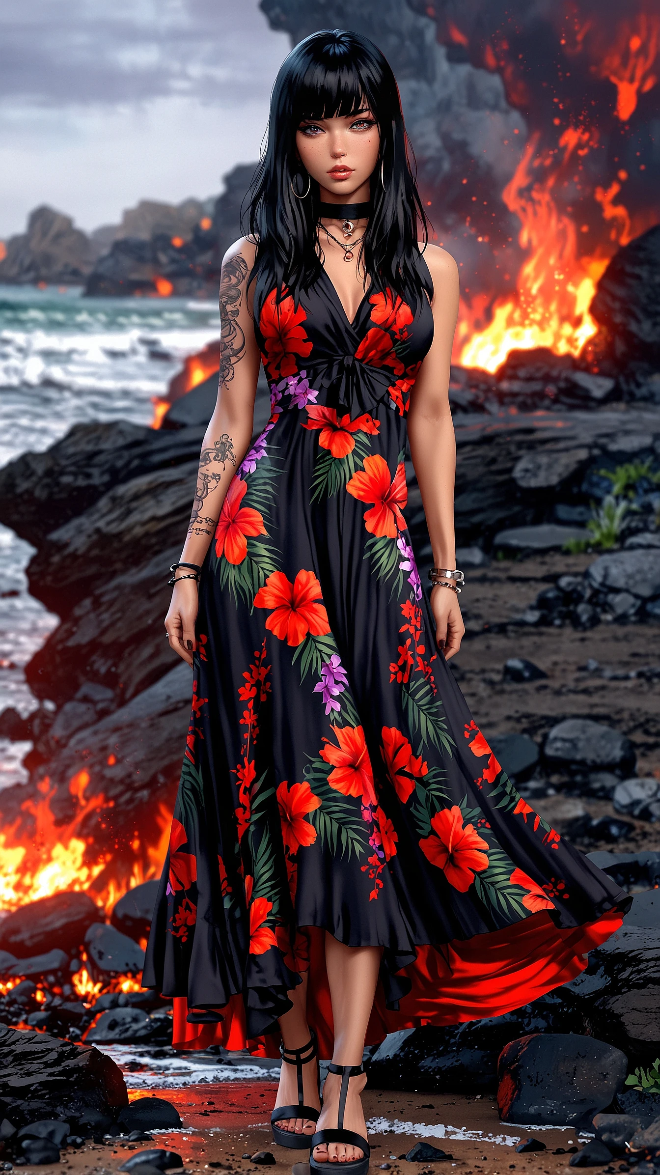 Full Body Image, zoomed out, Photo-Realistic, Complete full body Image of a beautiful, Gorgeous, ((40 years old) ) EMO, Goth, Punk, Japanese, Chinese, Spanish, Korean, Filipina Female, Instagram Influencer-model (((Extra Long layered Messy Black hair with ((Bangs) ) and purple and red highlights))), Extra Large Bright illuminating Blue Eyes, Full thick dark red lips, standing barefoot in a Hawaiian Park ((Head to Toe) ), Beautiful photo-realistic Beautiful, sharp focus, Wearing a colorful Hawaiian floral dress, rising from the molten lava of a spewing Volcano in Hawaii. Pele the fire goddess. Her wild beauty is more powerful with glowing lava. orchid band of flowers on her forehead